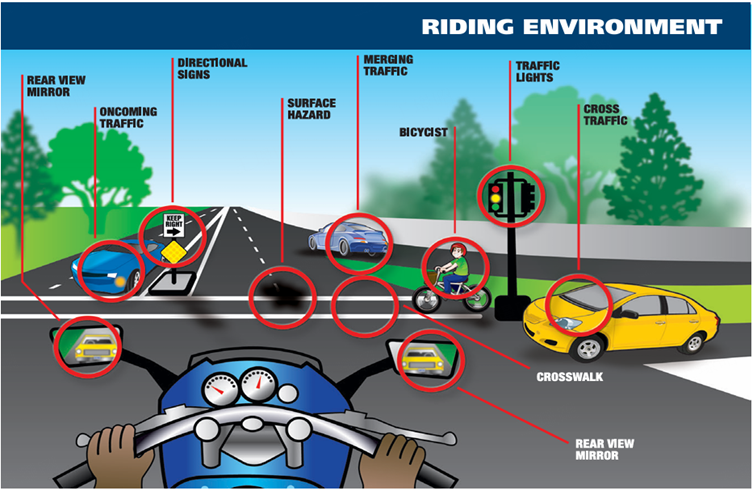 The above diagram illustrates the complex environment that awaits you, and supports the concept as the Electric Motorcycle Safety Foundation says, "Safe riding depends as much on the mental skills of awareness and judgment as it does on the physical skill of maneuvering the machine."